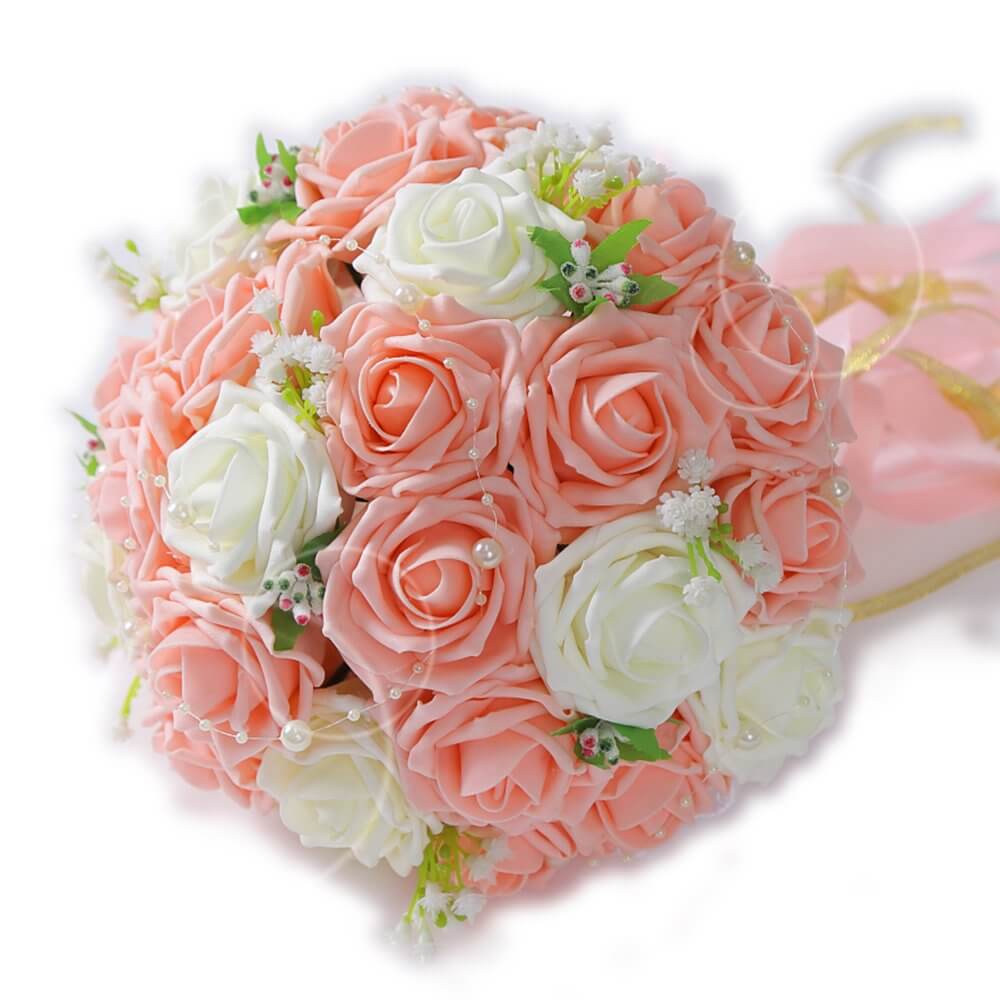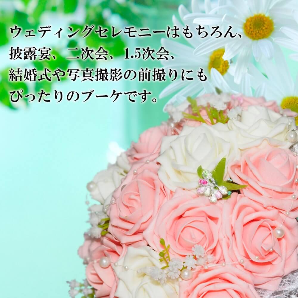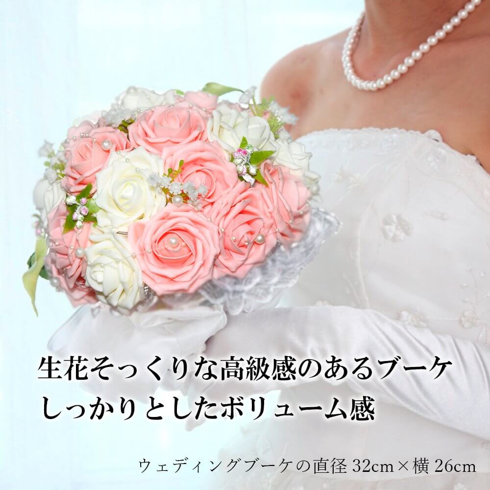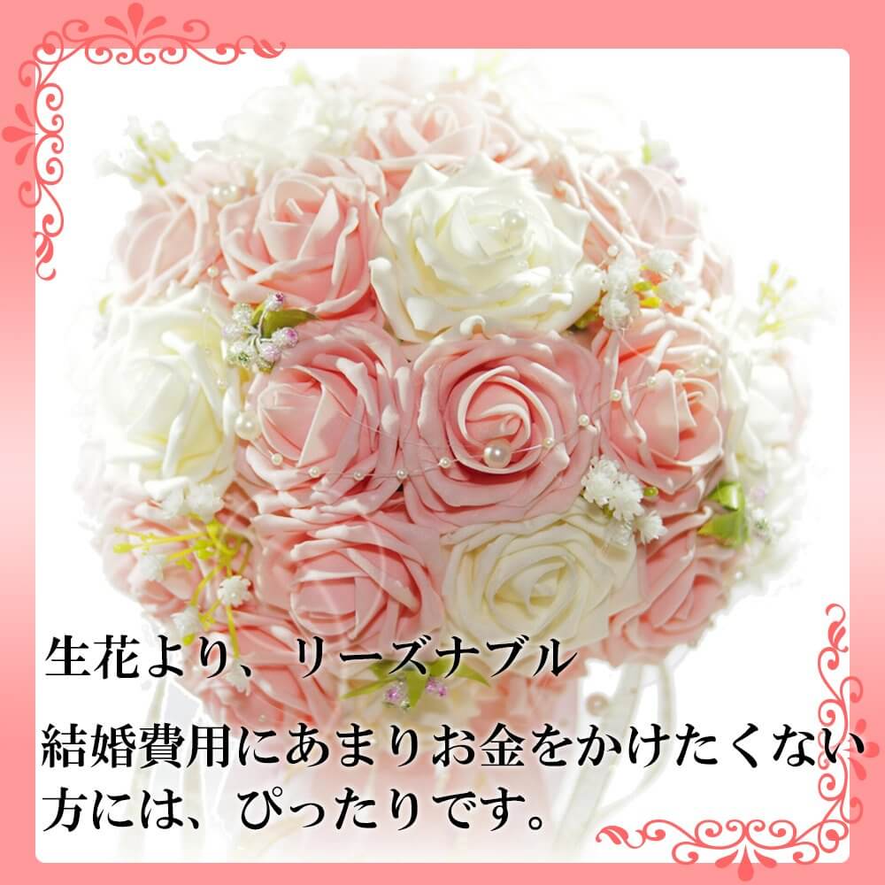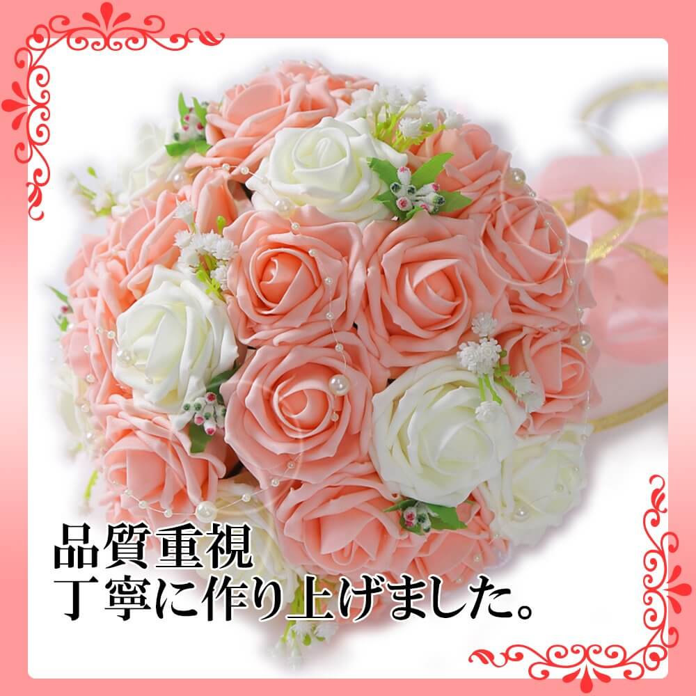 友人の結婚パーティーでブーケトスをしたいとのことで寄贈用に購入しました。高級なウエディングではなくパーティーだったので安価クラスのこちらを購入しました。無事にブーケトスの役目を果たし、大変喜ばれました。あくまで使い捨てというと語弊がありますが、質感は間に合わせ品かなと思いました。しかし新婦やブーケトスを貰った側にも喜んでもらえたので個人的には満足です。