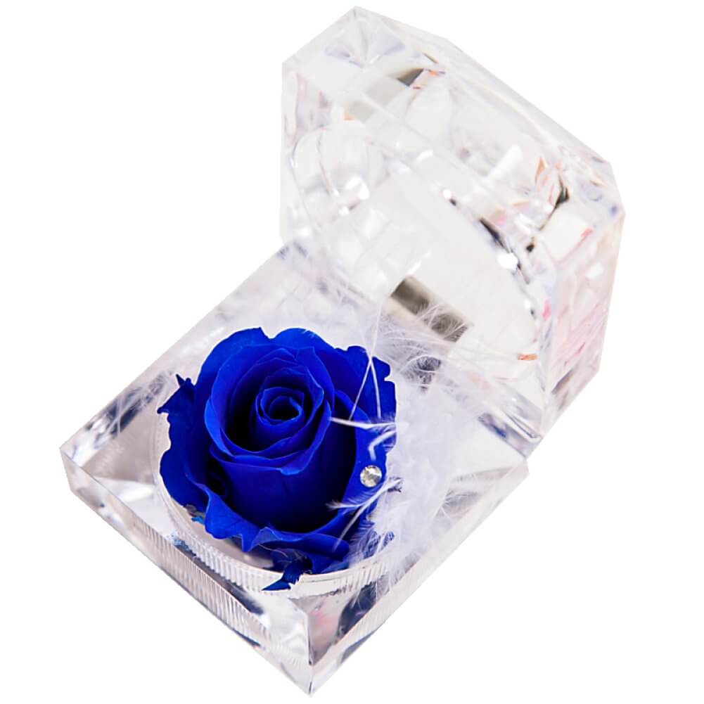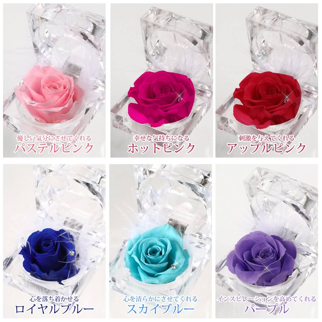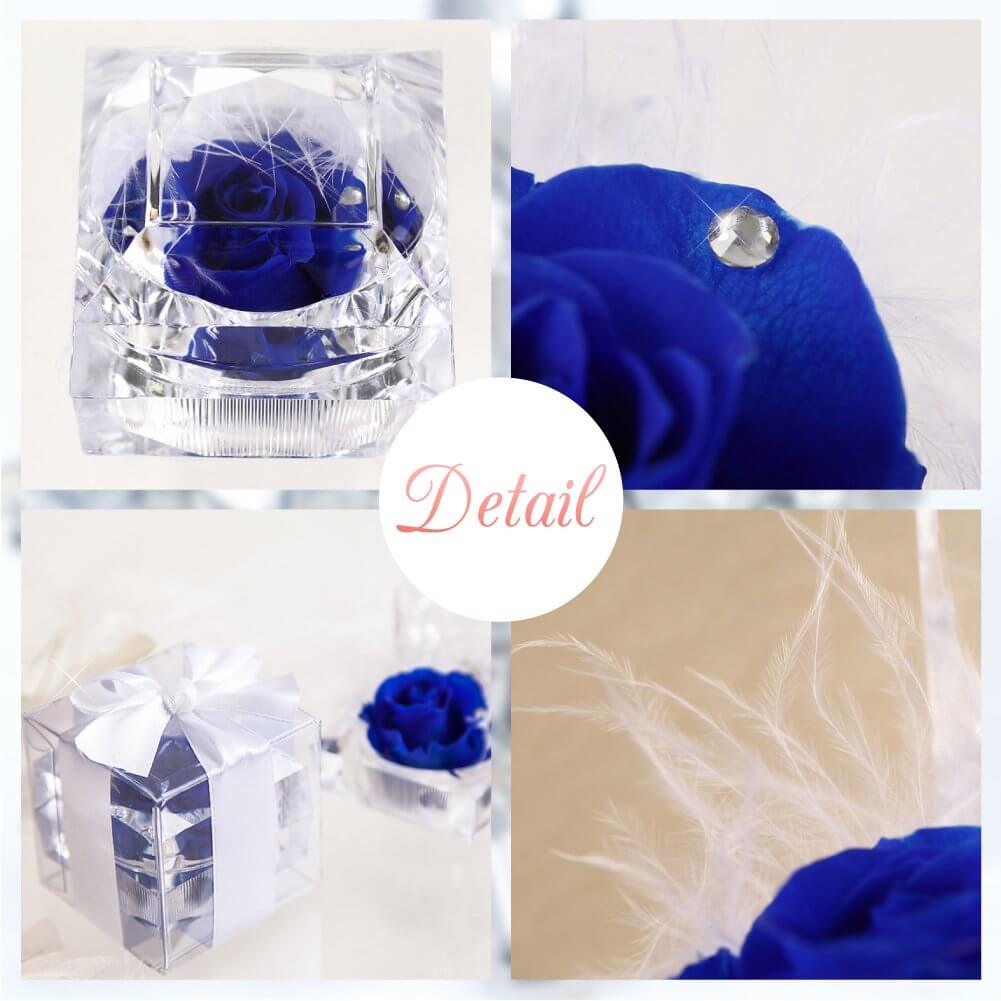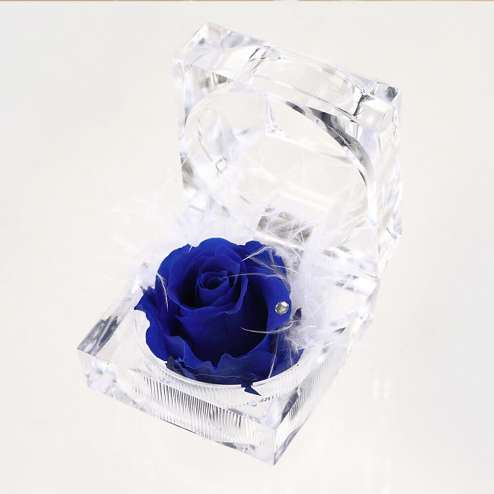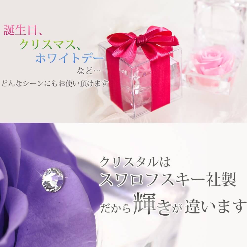 - 3cm前後のバラの小さなジュエリーケースアレンジ。透明のジュエリーケースのフタを開けると、ふわっと羽根が広がり、バラの花びらにはキラキラと輝くスワロフスキー社製クリスタルが付いているTEATSIGHTオリジナルのアレンジです。