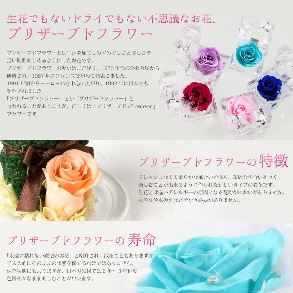 プリザーブドフラワーは造花とは違い、生花に特殊な加工を施した枯れないお花です。