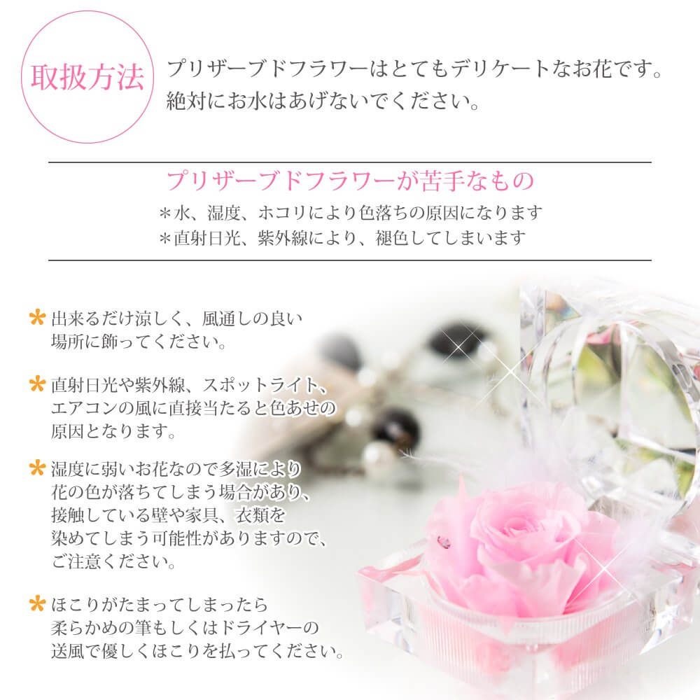 - お花はすべてプリザーブドフラワー専門工場で生花を加工しています。プリザーブドフラワーは日光や湿気を嫌います。直射日光及び高温多湿の場所を避けまた空調設備の前など乾燥しすぎる場所には置かないでください。天然素材のため、花の色合い・サイズに差がありますことをご了承ください。