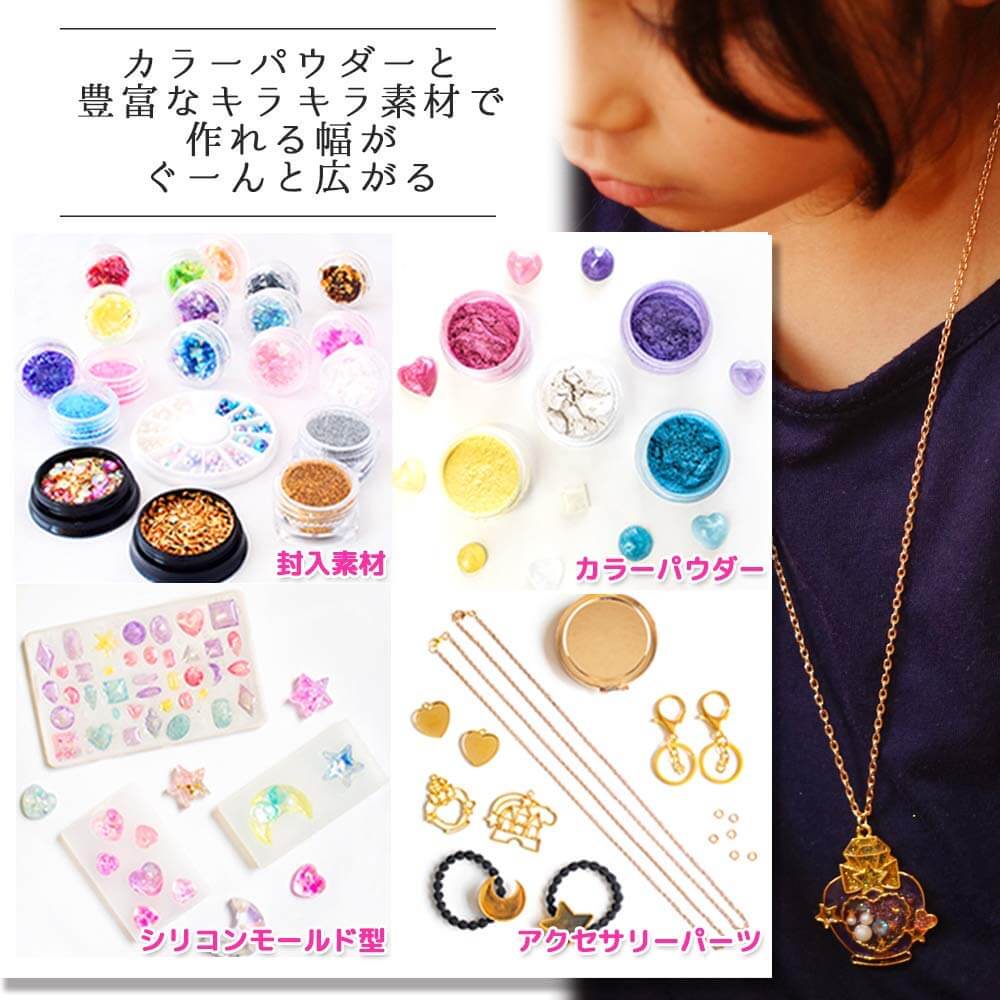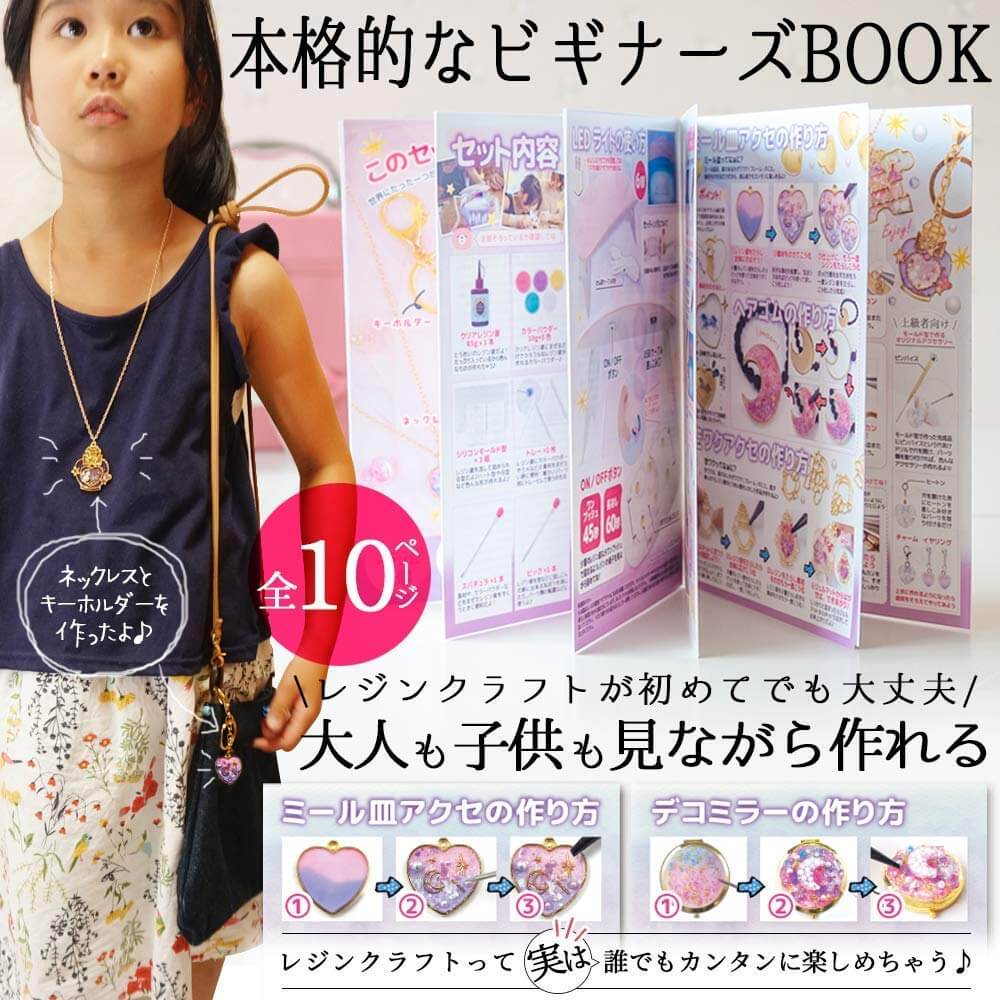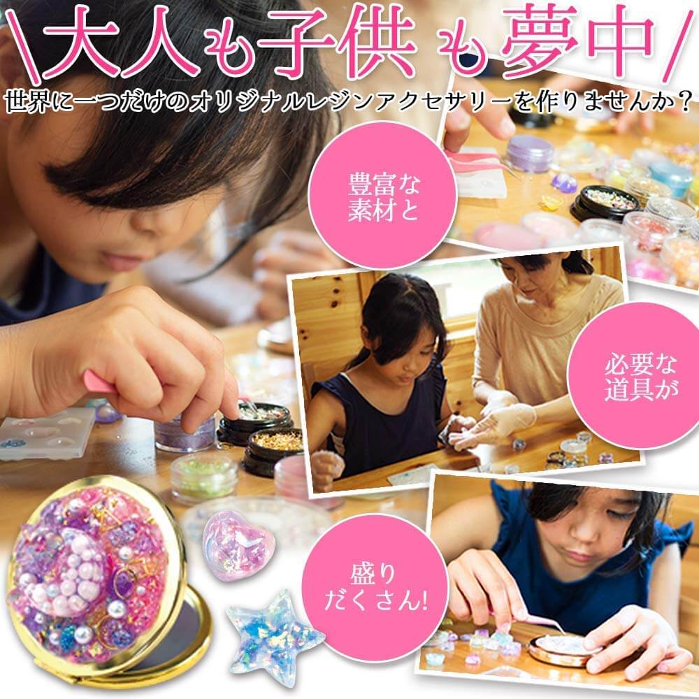 - ★アクセサリーパーツ17点★全部で7個のアクセサリーが作れるアクセパーツ付き!デコレーションミラー1個に、ネックレス2個、ヘアゴム2個、キーホルダー2個が入っているので親子でお揃いにしても◎です♪ ★キラキラ素材31点★ときめくのは子供だけじゃない!大人も心おどる、キラキラかわいい素材が31点も入っています♪ ★必須道具22点★レジンクラフトに欠かせない道具が22点も入っているので、届いたその日に始められます!シリコンモールドはなんと58種類の型が作れちゃいます! ★レジンクラフトが初めてのお子様も大人も安心して楽しめるビギナーズガイドブック付き! ★お片付けも楽しい?!内側がカワイイ花柄&小型ミラー付きの専用ボックス付き♪