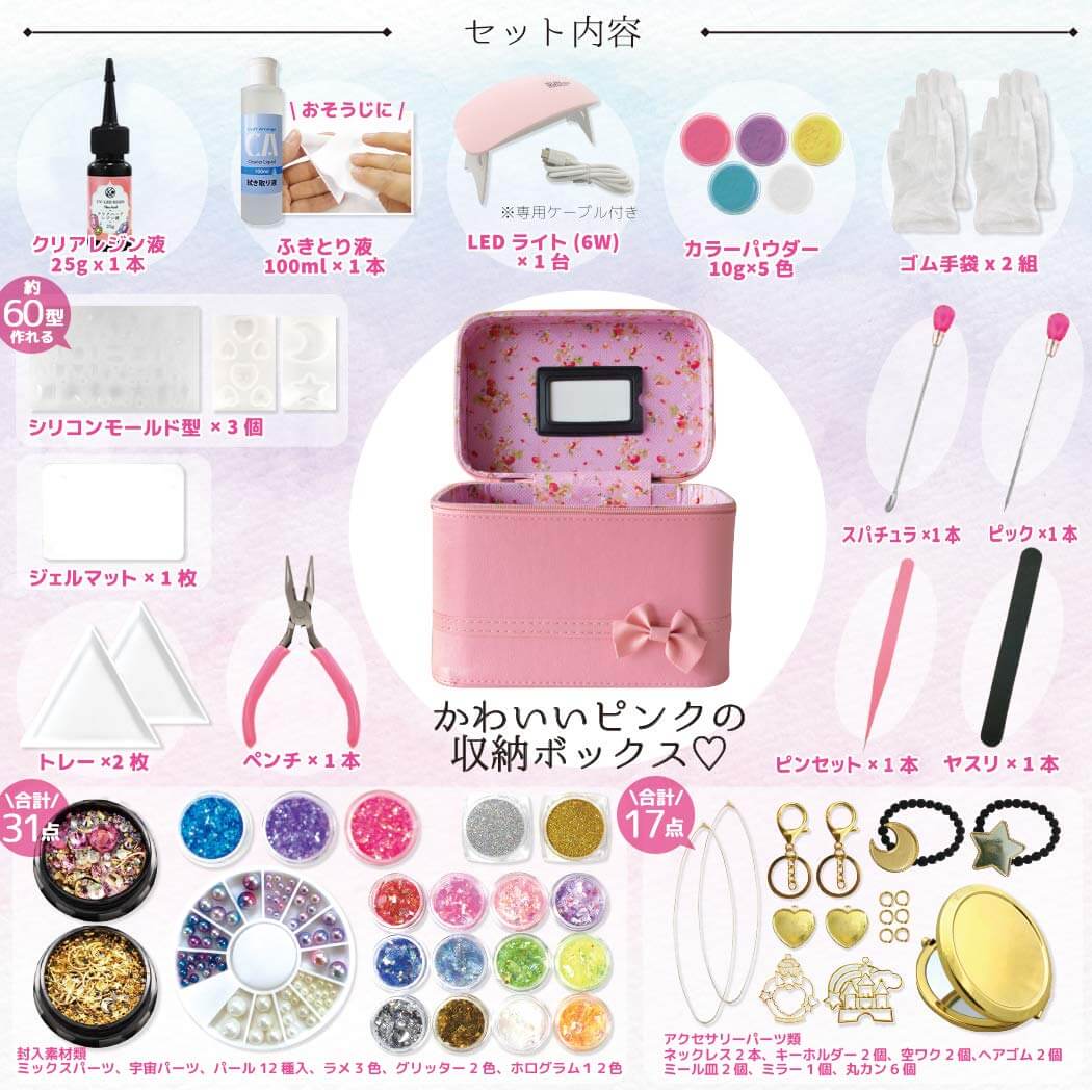 - 【セット内容】レジン液x1本 クリーナーx1本 専用ボックスx1個 ゴム手袋x2組 カラーパウダーx5色各1個(ブルー、ピンク、イエロー、パープル、ホワイト) LEDライト6Wx1個 LEDライト専用ケーブルx1本 シリコンモールドx3種(月&星型、ハート型、宝石型) 調色トレー(三角型)x2枚 ジェルマットx1枚 平ヤットコ(ペンチ)x1本 スパチュラx1本 ピックx1本 ピンセットx1本 ヤスリx1本 【金具パーツ】空ワクx2種(お城、香水瓶) ハート型ミール皿x2枚 ヘアゴムx2種(星、月) デコレーション用コンパクトミラーx1個 ネックレスx2本 キーホルダーx2個 丸カンx6個【封入素材】ホログラム12色セットx1個(シルバー、ゴールド、ブルー、ライトブルー,ピンク,ライトピンク,レッド、イエロー,オレンジ、ホワイト,グリーン、パープル) ラメx3色各1個(ピンク、パープル,ブルー) グリッター2色x各1個(シルバー、ゴールド) 宇宙パーツx1個 ミックスパーツx1個 パール12種(3色x各4サイズ入) ビギナーズガイドブックx1冊