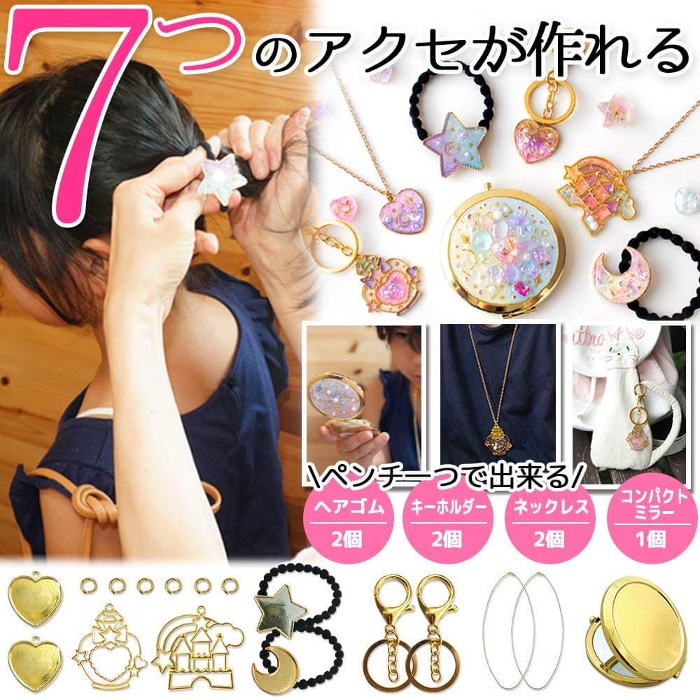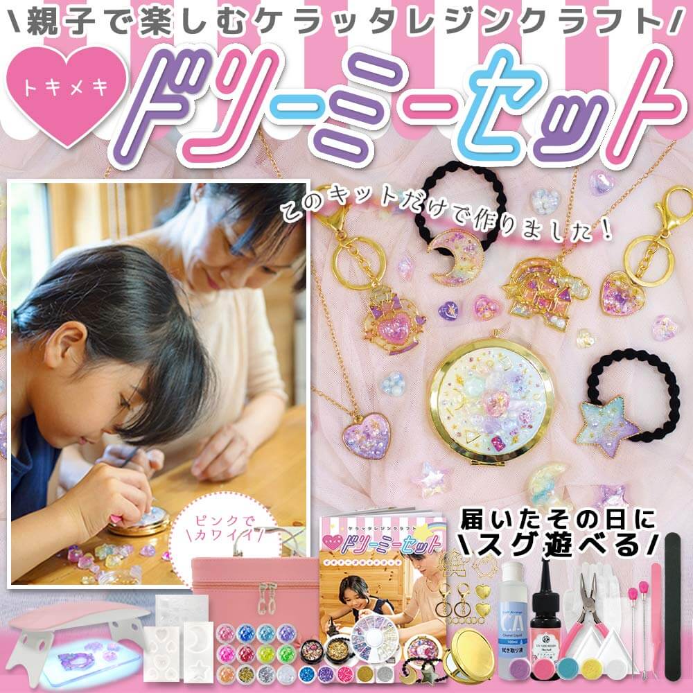 - 『親子でレジンクラフトをやってみたい!』 『だけど、難しそうだし道具を揃えるのも大変そう…』 ケラッタのドリーミーセットは、お子様だけでなく、大人でも十分楽しめる内容となっています!必要な道具が全て揃っているので、届いたその日におうちで楽しく簡単にアクセサリー作りを楽しめちゃいます! レジンクラフトの基本から上手に作るコツなど記載した”ガイドブック”も付いているので、初めてでも安心♪ ネックレス2個、キーホルダー2個、デコレーションミラー1個、ヘアゴム2個の全部で7個のアクセサリーが作れるので 親子で自分好みのアクセサリーを作ってオシャレを楽しめちゃいます♪
